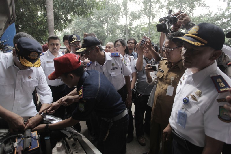 Didampingi Sekda Kota Tangerang Dadi Budaeri dan Kadishub Kota Tangerang Saeful Rohman, Budi mengecek langsung proses dan tahapan mulai dari pendaftaran sampai tahap pemeriksaan fisik angkutan online.