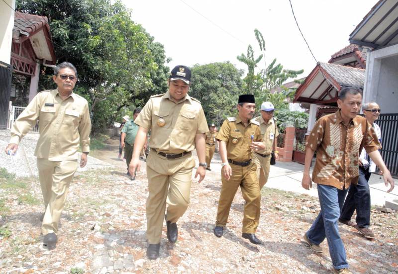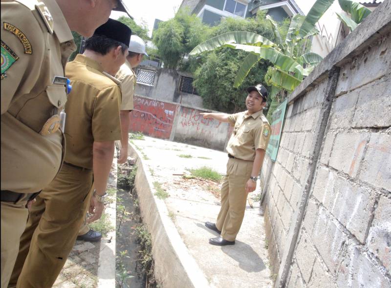 Sambil menyusuri saluran pembuangan perumahan, Wali Kota mengecek langsung kondisi saluran air di komplek tersebut yang memang sudah mengalami pendangkalan.