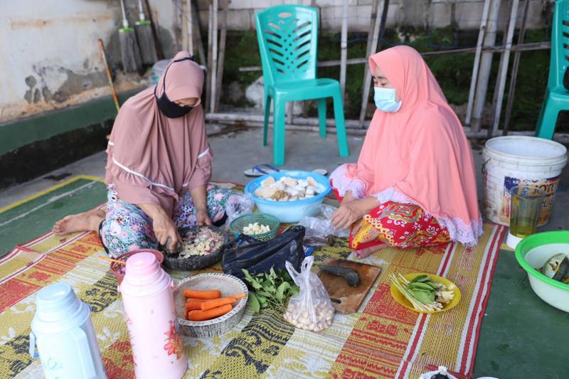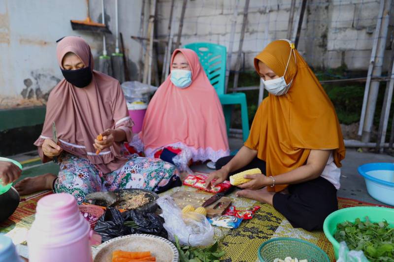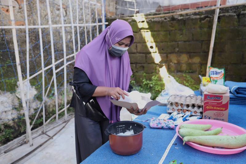 “Jadi, kami mulai masak dari jam sembilan itu untuk makan siang sekaligus makan sore atau malam. Nanti jam 11, makan siang akan diantarkan ke rumah-rumah warga yang sedang isolasi mandiri. Setelah itu, sekitar jam dua atau jam tiga sore, makanan untuk makan malam akan kami antar. Dalam sehari, langsung masak dua kali sekaligus,” ungkapnya.