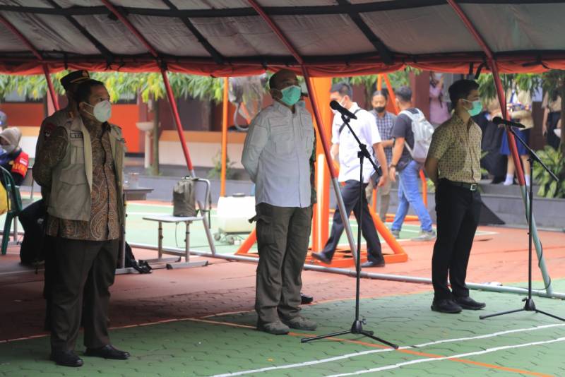Ribuan anak berusia 12 hingga 17 tahun melakukan vaksinasi yang diselenggarakan oleh Pemerintah Kota Tangerang bersama dengan Badan Intelejen Negara (BIN), di SMA Negeri 1 Kota Tangerang, pada Rabu (14/07/21).