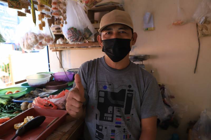“Saya di PHK dari pabrik saya bekerja. Disitu saya ajuin bantuan dan dapat Rp500 ribu. Atas diskusi bersama istri, saya mulai usaha jeruk peras pakai meja doang dengan uang bantuan itu. Seiring waktu berjalan, keuntungan dagang jeruk peras saya alihkan ke warung sayur yang saya baru buka. Sekarang, kami fokus dagang sayur aja, karena antusias jeruk peras mulai menurun,” ungkap Yanto.