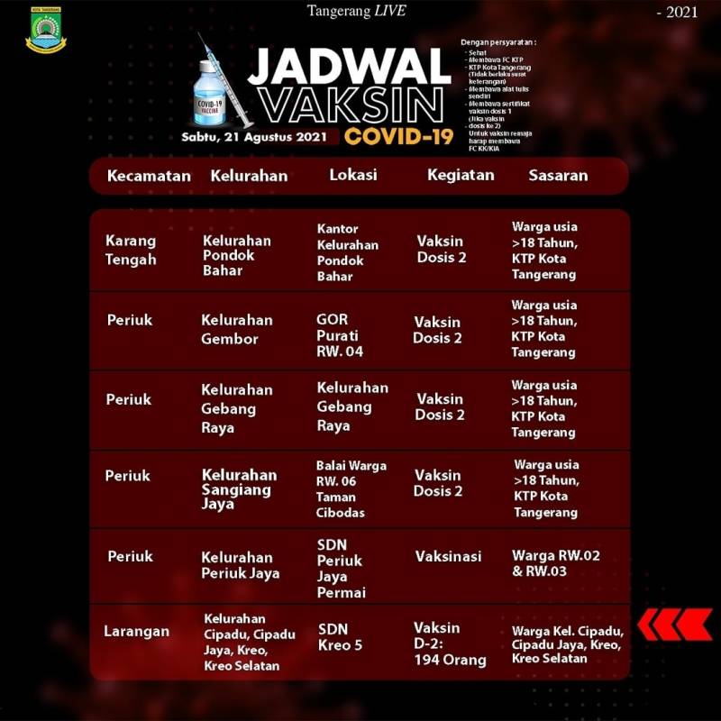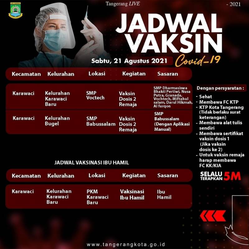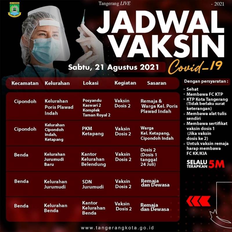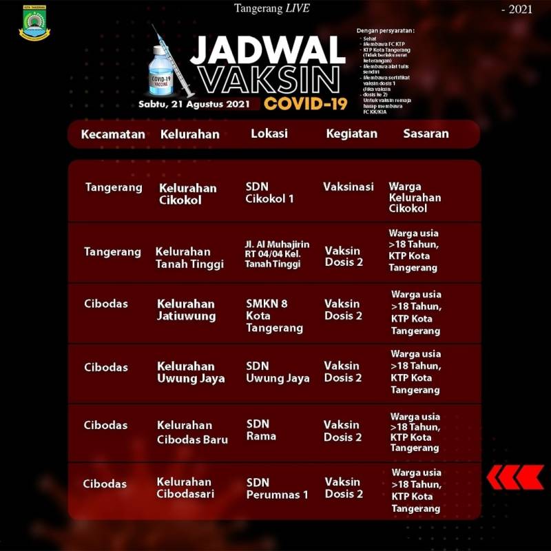 Oiya, jangan lupa untuk mendaftar terlebih dahulu secara online melalui website vaksinasi.tangerangkota.go.id , jika sudah mendapatkan jadwal datang sebelum pukul 08.00 ya dan datang ke tempat vaksin sesuai domisili warga.