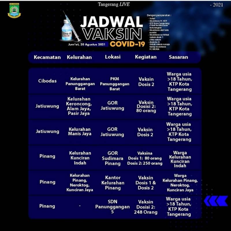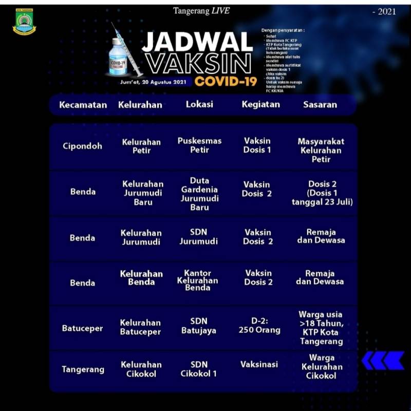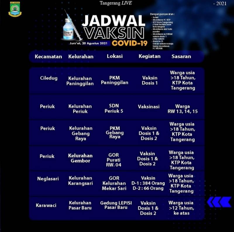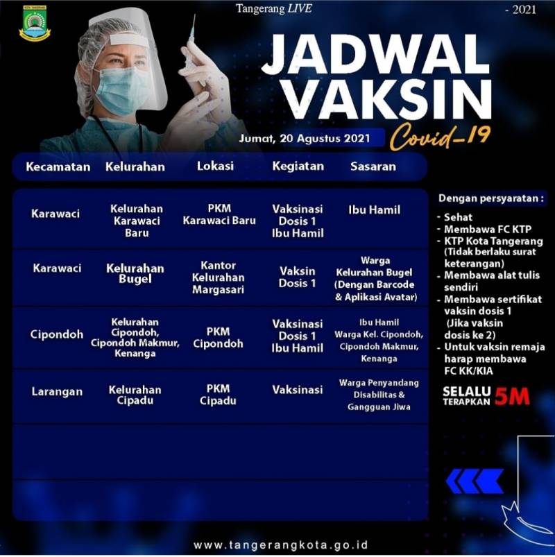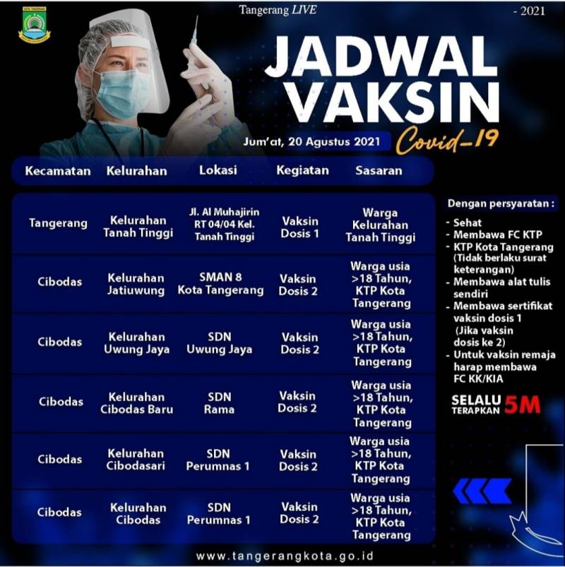 Oiya, mimin saranin untuk mendaftar terlebih dahulu secara online melalui website vaksinasi.tangerangkota.go.id , datang sebelum pukul 08.00 ya dan datang ke tempat vaksin sesuai domisili warga.