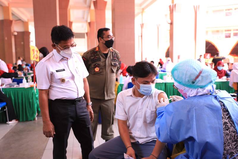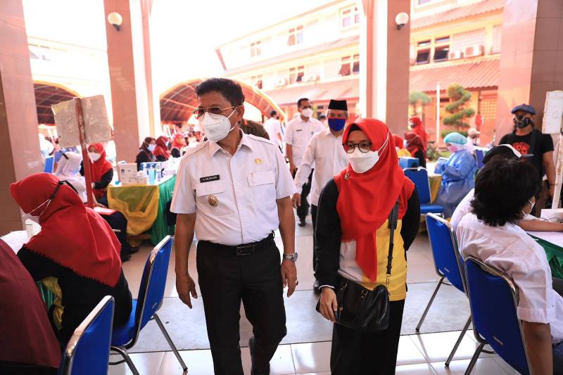 Terus mengejar target herd immunity Kota Tangerang, tak terkecuali pada kategori pelajar. Terlebih, memperkuat persiapan Pembelajaran Tatap Muka (PTM) di Kota Tangerang. Pemerintah Kota Tangerang melalui Dinas Kesehatan (Dinkes) menggelar vaksinasi massal khusus pelajar tingkatan SMP - SMA, di Puspem Kota Tangerang, Rabu (1/9/21).