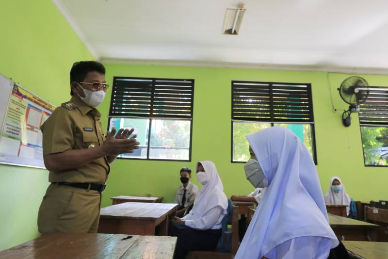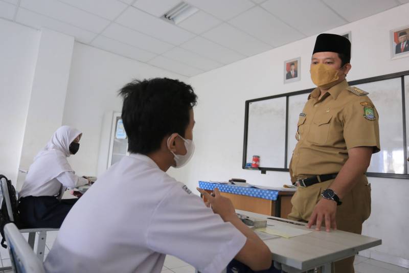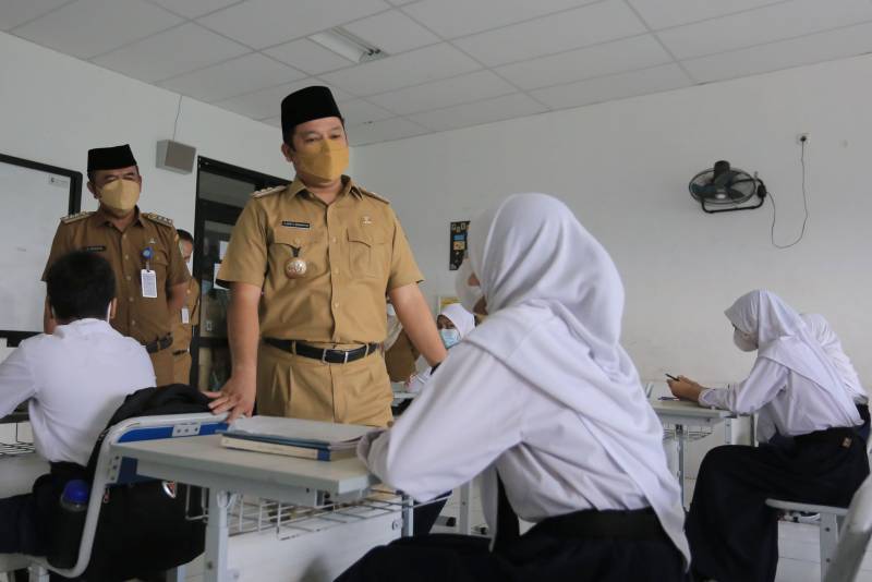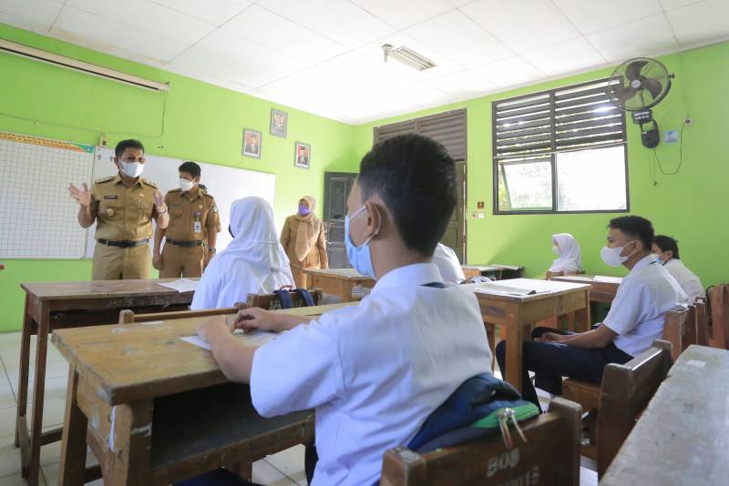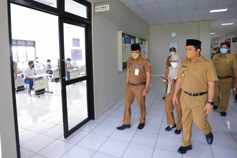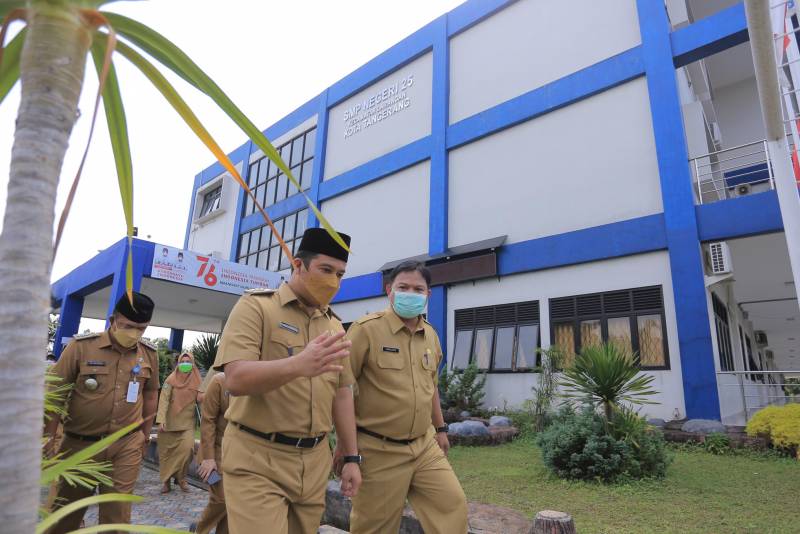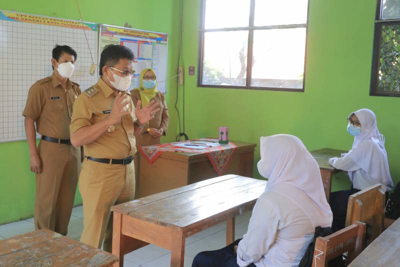 Wali Kota Tangerang H. Arief R. Wismansyah didampingi Kepala Dinas Pendidikan Jamaluddin serta Plt. Kepala Dinas Kesehatan Kota Tangerang dr Dini Anggraeni meninjau langsung pelaksanaan Pembelajaran Tatap Muka terbatas yang salah satunya dilaksanakan di SMP Negeri 25 Larangan, Senin (13/9/21).