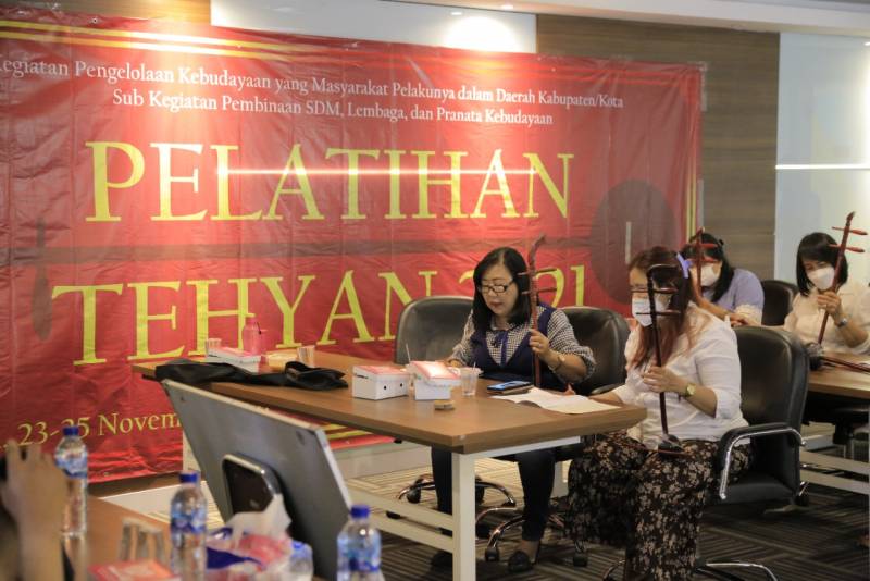 Menjalankan program pelestarian budaya, pemerintah kota Tangerang, melalui Dinas Kebudayaan, Pariwisata dan Pertamanan (DISBUDPARMAN), menggelar pelatihan alat musik tehyan, di Aeropolis, Kecamatan Neglasari, Kamis, 25 November 2021.