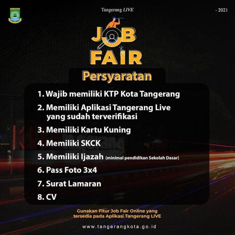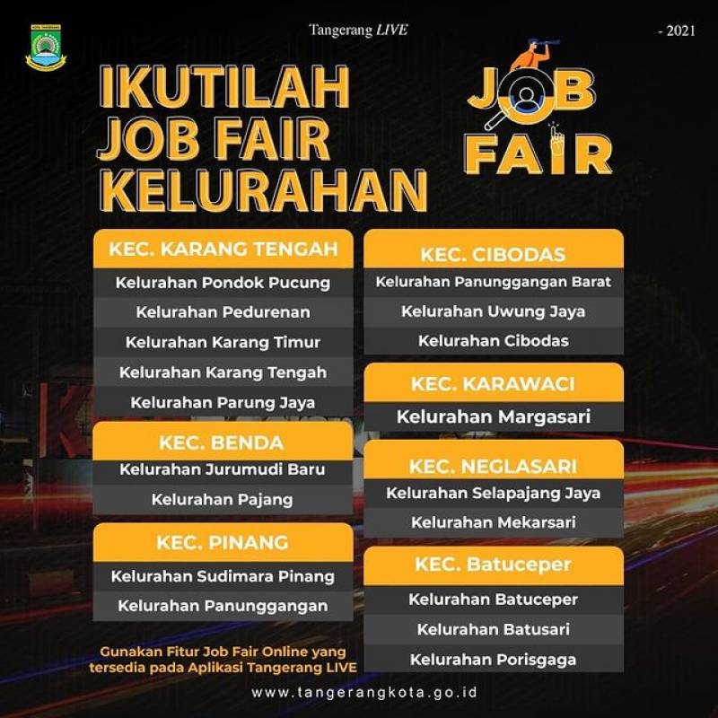 Jobfair Kelurahan dimulai secara bertahap tanggal 07 Desember 2021...Yuk ikutan Jobfair di Kelurahan wilayahmu, siapkan berkas-berkasnya ya warga #KotaTangerang jangan sampai ketinggalan☺️