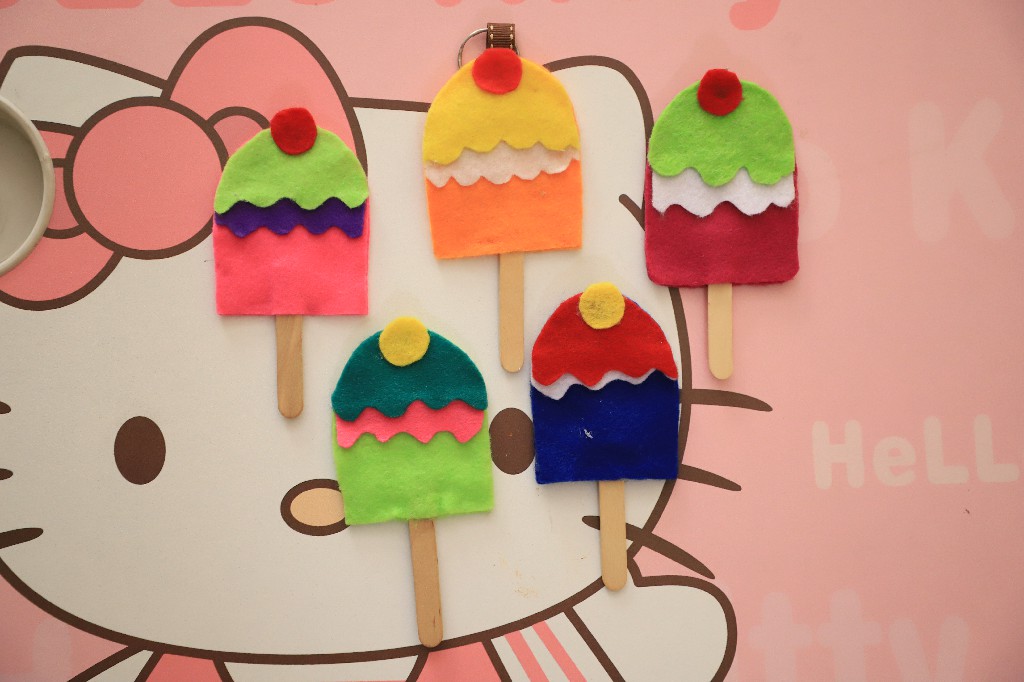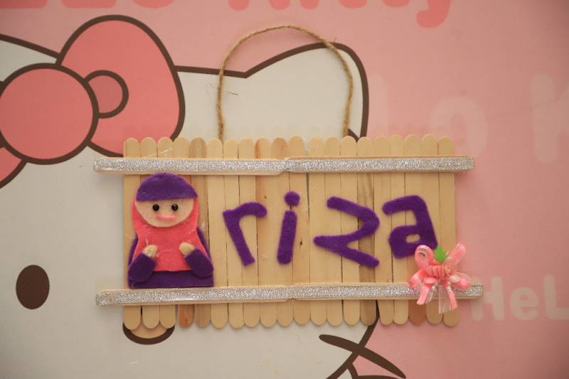 "Awalnya karena anak saya sering jajan es krim dan sticknya itu menumpuk. Dipikir-pikir sayang juga. Akhirnya, pertama kali bikin hiasan semacam gantungan untuk di depan rumah," ungkapnya.
