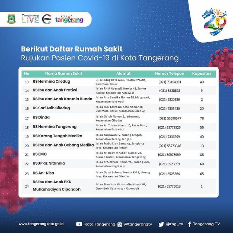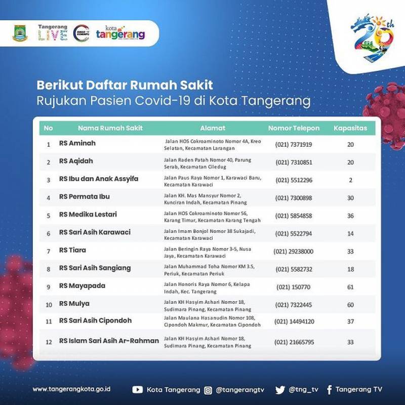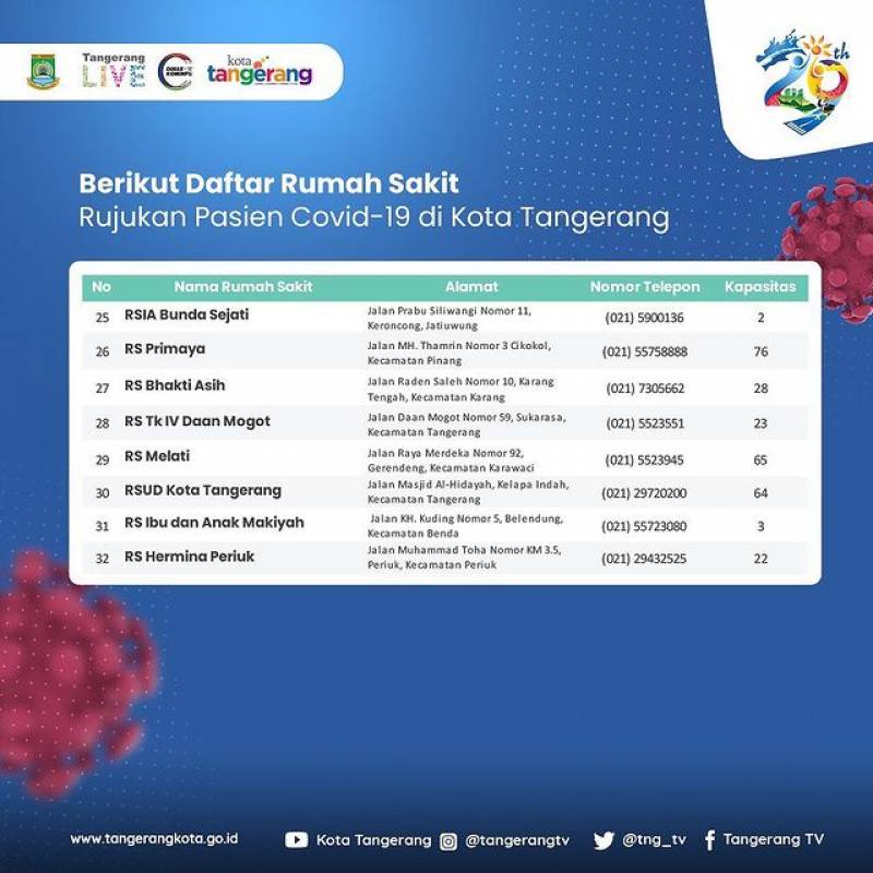 Berikut daftar 32 Rumah Sakit (RS) rujukan pasien Covid-19 yang tersebar di Kota Tangerang dengan kapasitas 1.149 tempat tidur. Terlampir dengan alamat RS, nomor telepon hingga kapasitas tempat tidur yang tersedia.