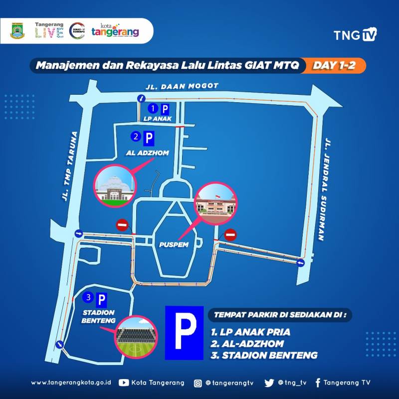 Dua hari menjelang Musabaqoh Tilawatil Quran (MTQ) ke-21 Kota Tangerang, yang akan berlangsung pada 23 - 25 Mei. Pemerintah Kota (Pemkot) Tangerang melalui Dinas Perhubungan (Dishub) selama pagelaran akan menerapkan sederet rekayasa lalu lintas dan kantong parkir, untuk memperlancar arus lalu lintas selama pelaksanaan.