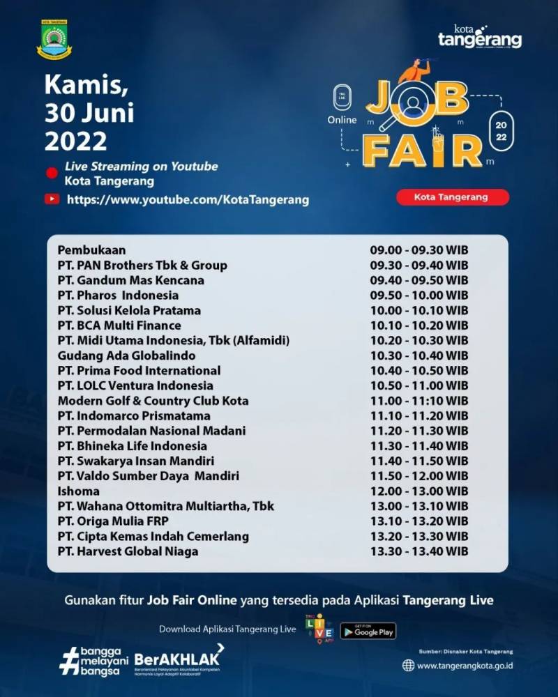 Pengumuman untuk warga #KotaTangerang Virtual Job Fair mengalami perubahan jadwal yaitu pada hari Kamis, 30 Juni 2022 yang diadakan secara Live Streaming di Channel Youtube Kota Tangerang.