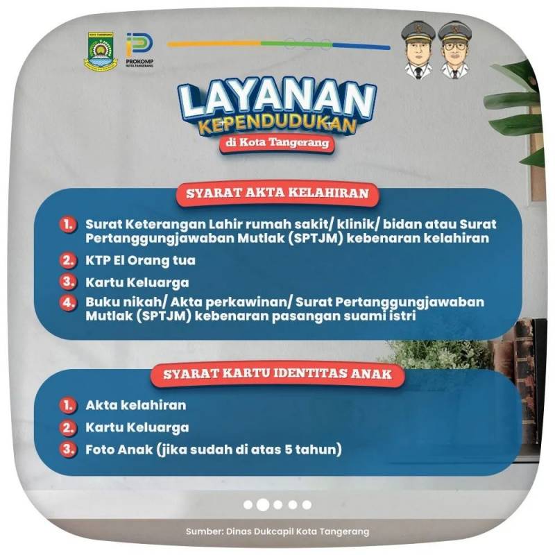 Halo warga Kota Tangerang!Mengurus dokumen kependudukan di Kota Tangerang gak pake ribet, loh! Bisa secara online ataupun secara langsung di kantor dan booth Dukcapil. Yuk simak info lengkap dan persyaratannya!