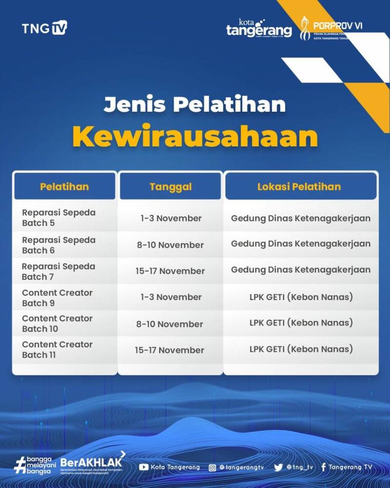 Yuk segera cek agenda pelatihan kewirausahaan dan segera daftarkan diri kalian melalui aplikasi Tangerang Live di Tangerang Cakap Kerja!