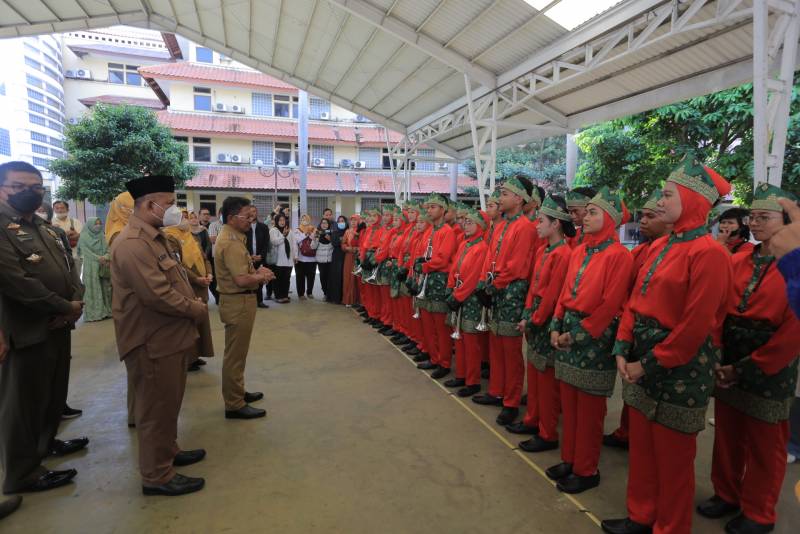 Usai apel pagi, Sachrudin bersama kepala OPD dan pegawai Pemkot Tangerang berkesempatan menyaksikan sesi gladi tim Drumband Kota Tangerang yang akan menjadi kontingen dalam cabang olahraga Drumband di Porprov VI Banten mendatang.