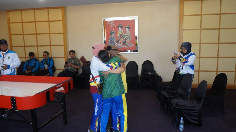 Dua atlet Kota Tangerang yang meraih medali emas tersebut yakni,Kumiyah dan Wiwin yang usai pertandingan tidak bisa menahan haru atas torehan medali yang diraihnya.