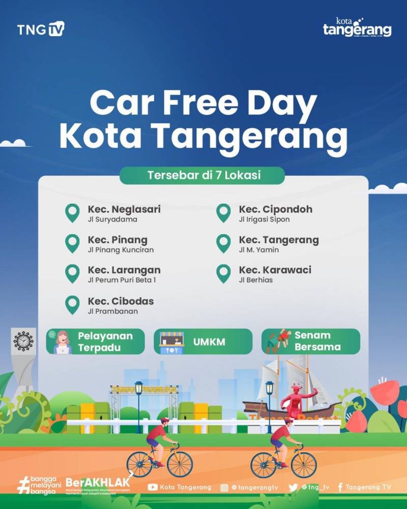 Ayo kunjungi Car Free Day (Hari Bebas Kendaraan Bermotor) Kota Tangerang yang diadakan pada Minggu, 11 Desember 2022 di 7 Lokasi yaitu :