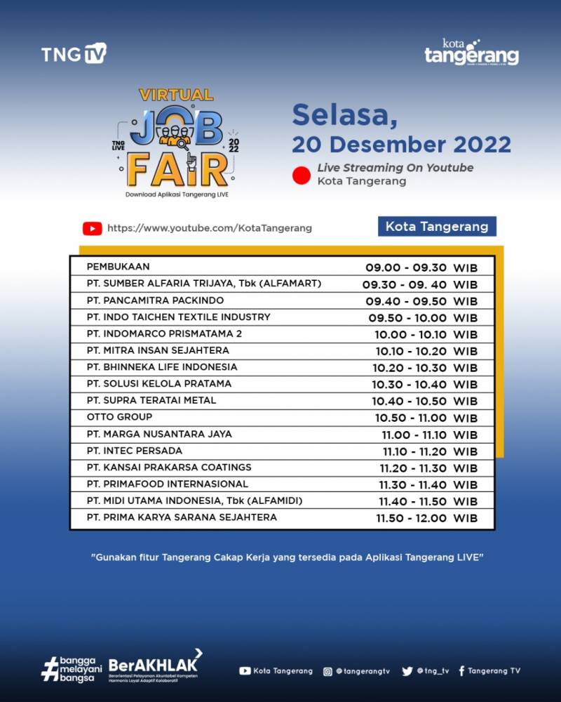 Para pencari kerja, khususnya masyarakat Kota Tangerang diimbau untuk tidak melewati kesempatan ini. Pasalnya, Pemerintah Kota (Pemkot) Tangerang melalui Dinas Ketenagakerjaan (Disnaker) pada Selasa (20/12) besok akan kembali menggelar Virtual Job Fair, yang akan disiarkan live melalui chanel youtube Kota Tangerang.