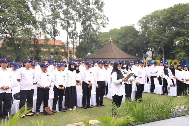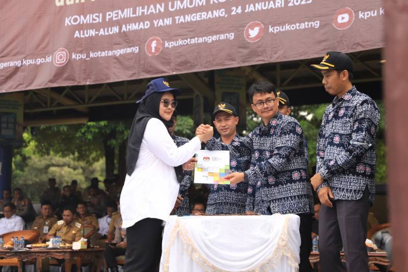 Menjelang Pemilihan Umum (Pemilu) Serentak tahun 2024, Komisi Pemilihan Umum (KPU) Kota Tangerang melaksanakan pelantikan dan pengucapan sumpah janji Panitia Pemungutan Suara (PPS) serta apel serentak Panitia Pemilihan Kecamatan (PPK) se-Kota Tangerang, di Alun-alun Ahmad Yani, Kota Tangerang, pada Selasa (24/1/23).
