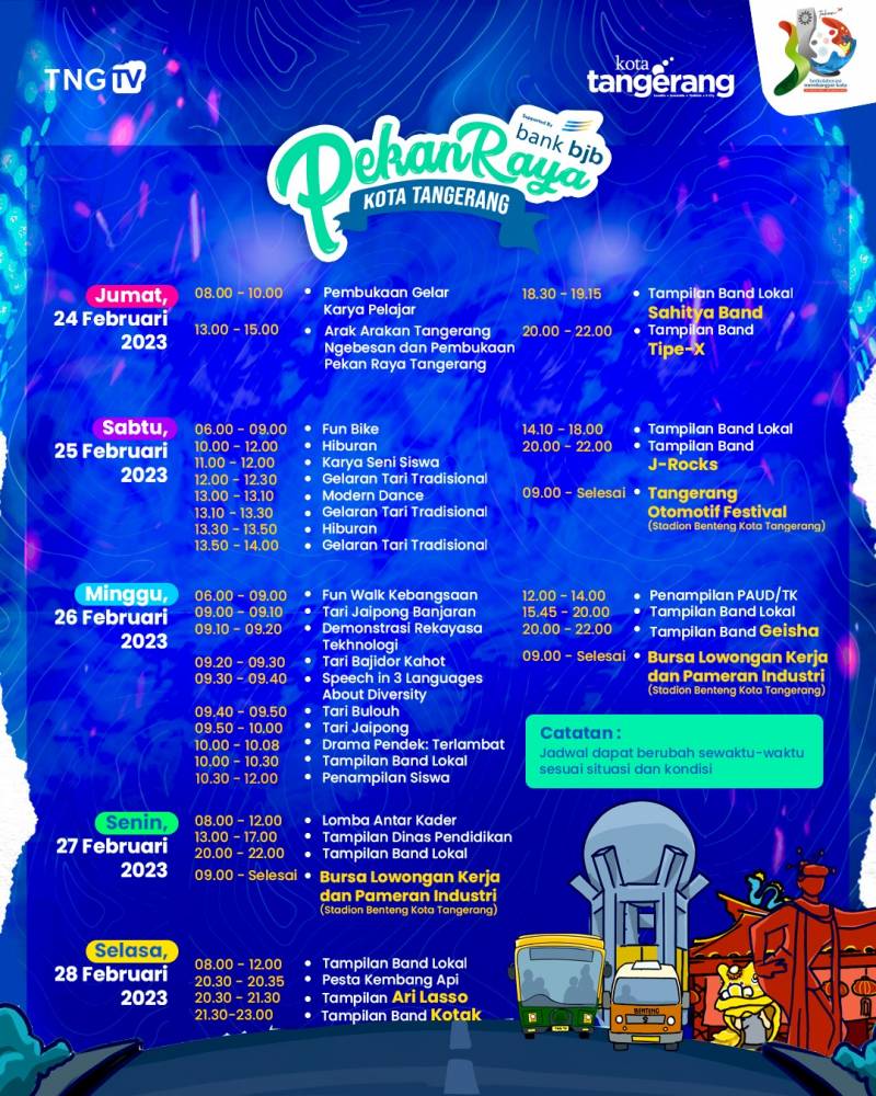 Lanjutnya, pastikan kalian yang ingin datang ke Pekan Raya Kota Tangerang menggunakan outfit yang nyaman dan sopan, untuk berlama-lama di Pekan Raya Kota Tangerang. "Terlebih, pakai outfit yang juga keren untuk menyaksikan konser band J-Rock nanti malam. Semoga hiburan ini dapat menyenangkan warga Kota Tangerang," harapnya.