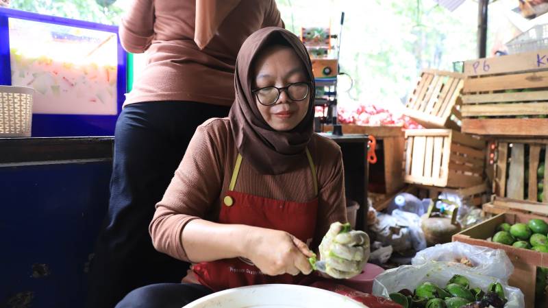 Ia melanjutkan, buah-buahan yang digunakan semua adalah buah asli. Kurang lebih sebanyak 20 kilogram buah dapat diolah menjadi es buah dan berbagai macam jus, dan dalam sehari dapat menjual 4000 cup es.