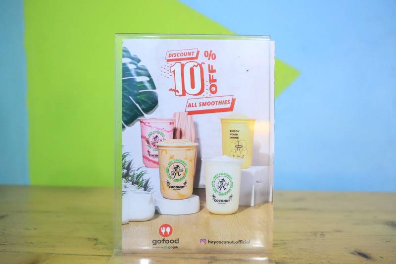 Dibuka sejak 7 januari 2021, Hey Coconut menjual berbagai macam varian smoothies mulai dari coconut smoothies original, oreo, strawberry, manga, serta caramel. Tak ketinggalan, es kelapa muda original serta coconut jelly dengan varian ukuran yang dijual.