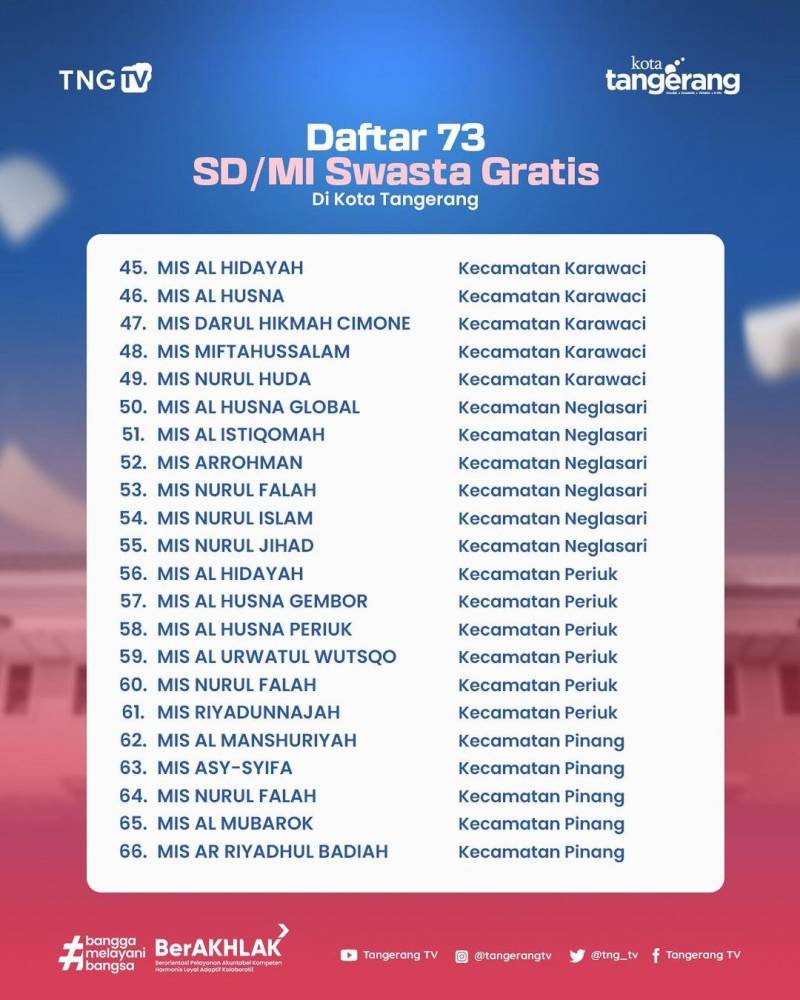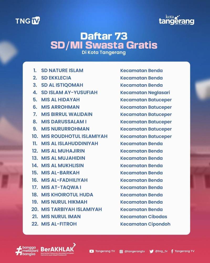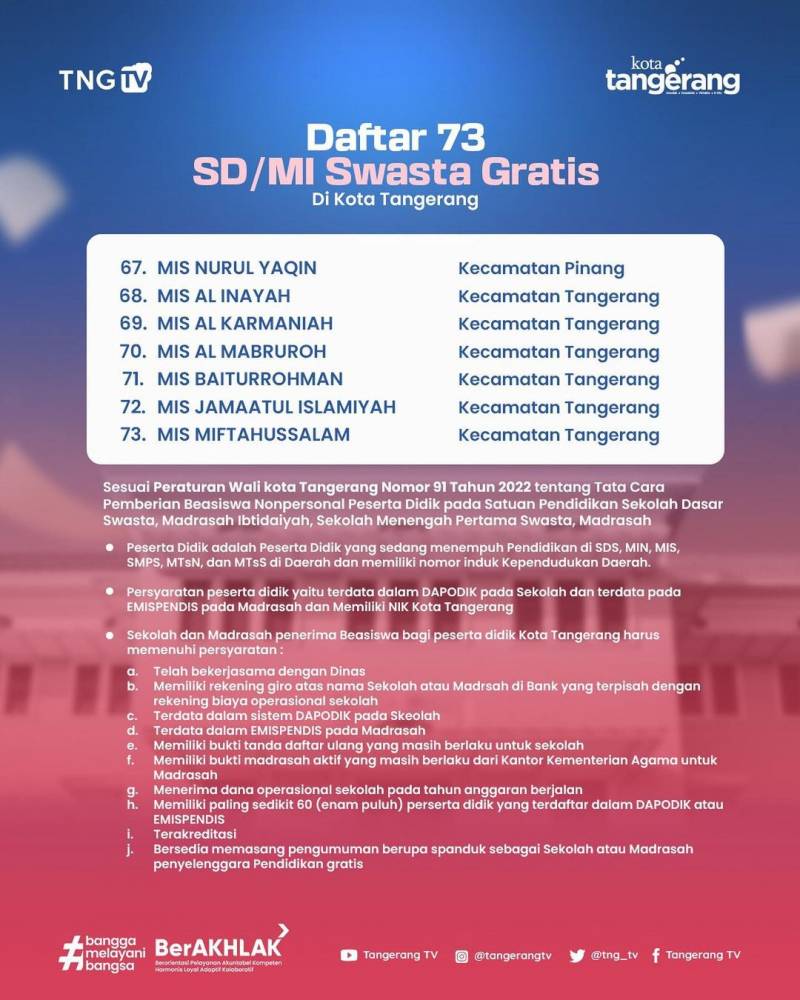 ‼️GRATIS GRATIS ‼️Pemerintah Kota Tangerang gratiskan biaya sekolah di 73 Sekolah Dasar (SD)/ Madrasah Ibtidaiyah (MI) Swasta.