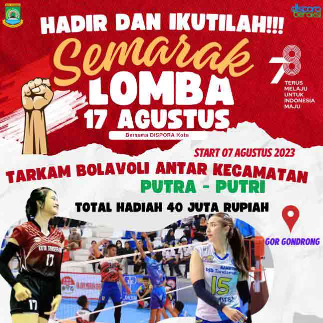 Ramaikan Kemerdekaan ke-78 RI, Pemerintah Kota (Pemkot) melalui Dinas Pemuda dan Olahraga (Dispora) akan menggelar pertandingan antar kampung (Tarkam) futsal dan bola voli indoor antar Kecamatan, yang berlangsung selama sepekan dari 7-14 Agustus 2023, dimana untuk pertandingan Voli dilaksanakan di Gor Gondrong, Kecamatan Cipondoh, dan untuk pertandingan futsal diadakan di Gor Jatiuwung, Kecamatan Jatiuwung.