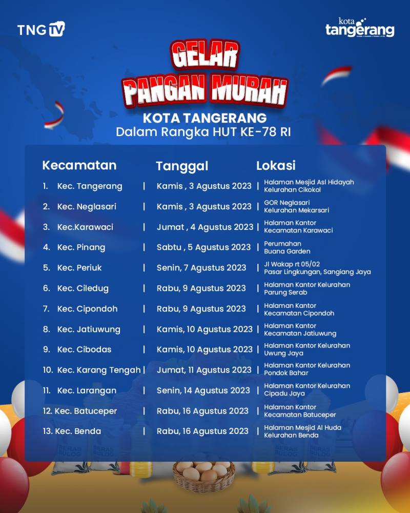 Berikut jadwal Gelar Pangan Murah 13 Kecamatan di Kota Tangerang;