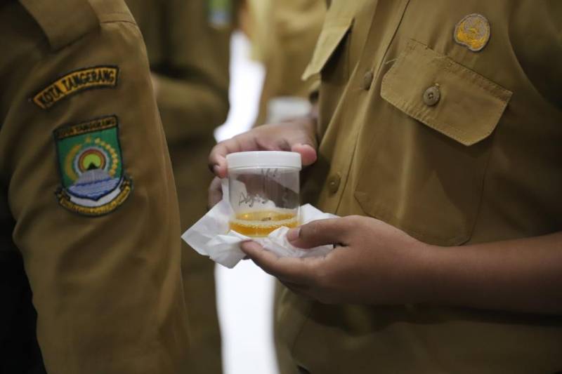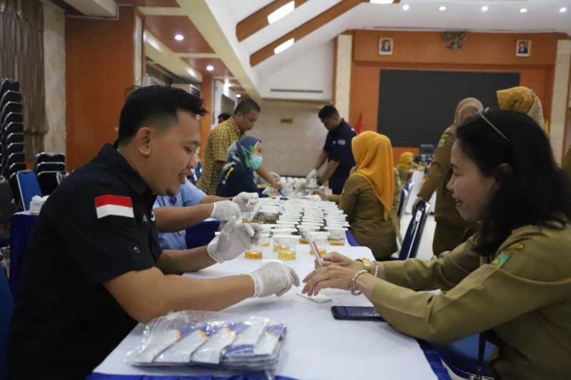 Badan Kesatuan Bangsa dan Politik (Kesbangpol) Kota Tangerang bersama Badan Narkotika Nasional (BNN) Kota Tangerang melakukan pemeriksaan tes urine dadakan, yang diikuti 291 pegawai baik ASN maupun THL, di lingkup Sekretariat Daerah Pemkot Tangerang, di ruang Al Amanah, Puspem Kota Tangerang, Selasa (5/9/23).