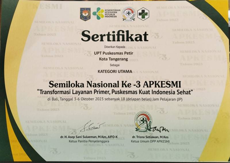 Pemerintah Kota (Pemkot) Tangerang kembali mencatat prestasi tingkat nasional di bidang kesehatan. Terbaru, Unit Pelaksana Teknis (UPT) Puskesmas Petir baru saja meraih penghargaan sebagai Kategori Utama pada Semiloka Nasional ke-3 Akselerasi Puskesmas Indonesia (APKESMI) Tahun 2023.