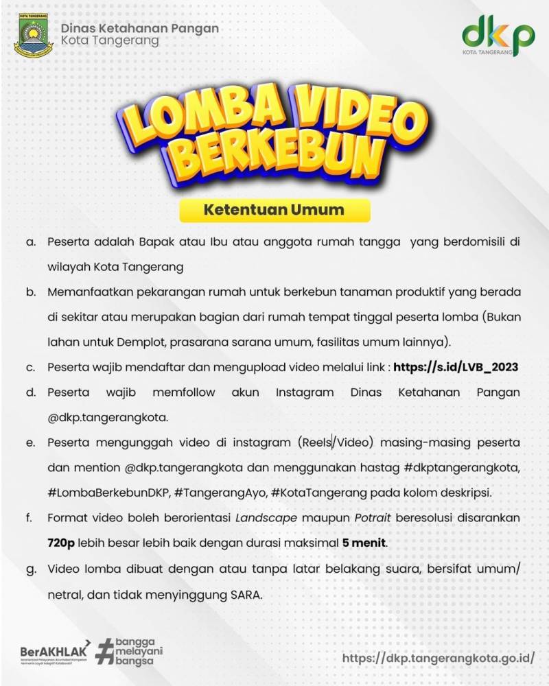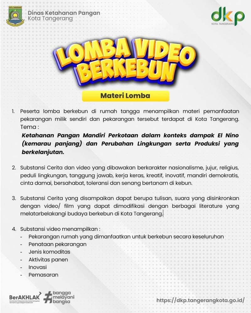 Sebagai upaya meningkatkan semangat dan minat berkebun, DKP Kota Tangerang mengadakan lomba video berkebun yang dapat diikuti masyarakat secara gratis tanpa dipungut biaya. Dengan mengusung tema Ketahanan Pangan Mandiri Perkotaan dalam konteks dampak El Nino (kemarau panjang) dan Perubahan Lingkungan serta produksi berkelanjutan. Pendaftaran lomba video berkebun dibuka 29 Oktober 2023.