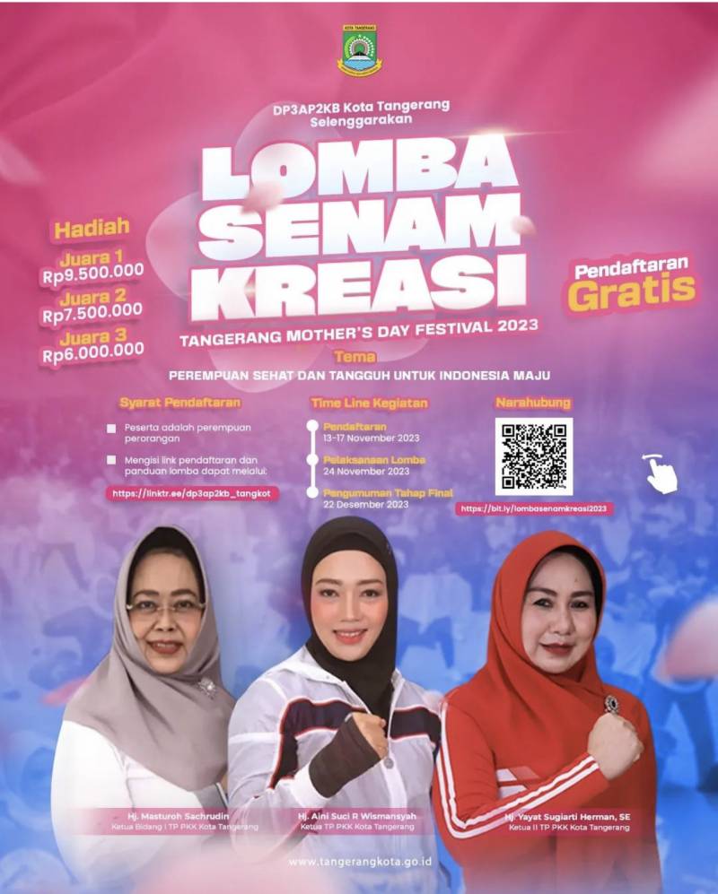 Pemerintah Kota (Pemkot) Tangerang melalui Dinas Pemberdayaan Perempuan, Perlindungan Anak, Pengendalian Penduduk dan Keluarga Berencana (DP3AP2KB) Kota Tangerang menyelenggarakan Lomba Senam Kreasi dalam rangka memeriahkan Hari Ibu mendatang. Terbuka untuk seluruh perempuan perorangan, Lomba Senam Kreasi ini dilengkapi dengan jumlah total hadiah yang mencapai 23 juta rupiah.
