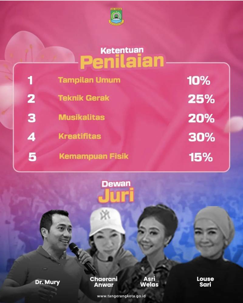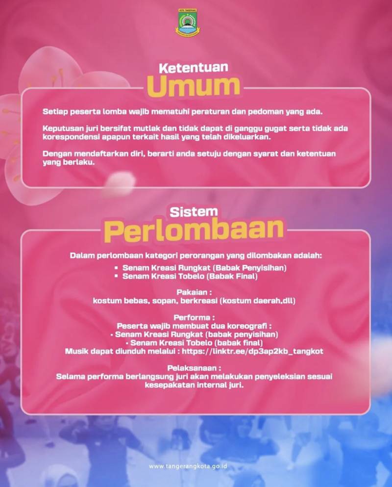 “Para peserta Lomba Senam Kreasi nanti akan diwajibkan membuat dua koreografi kreatif untuk kategori yang berbeda-beda, yakni Senam Kreasi Rungkat untuk babak penyisihan dan Senam Kreasi Tobelo untuk babak final. Silahkan diramaikan, karena perlombaan unik dan bergengsi ini dibuka secara umum dan gratis,” ujar Kepala DP3AP2KB Kota Tangerang, Jatmiko, Selasa, (14/11/23).