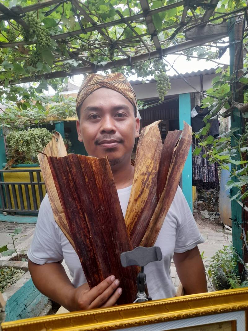 Ia pun mencari media lain yang sesuai dengan keinginannya, hingga akhirnya ketemu pelepah pisang. Menurutnya teknik melukis pelepah dengan lukis bakar sama hanya saja yang membedakan di medianya.