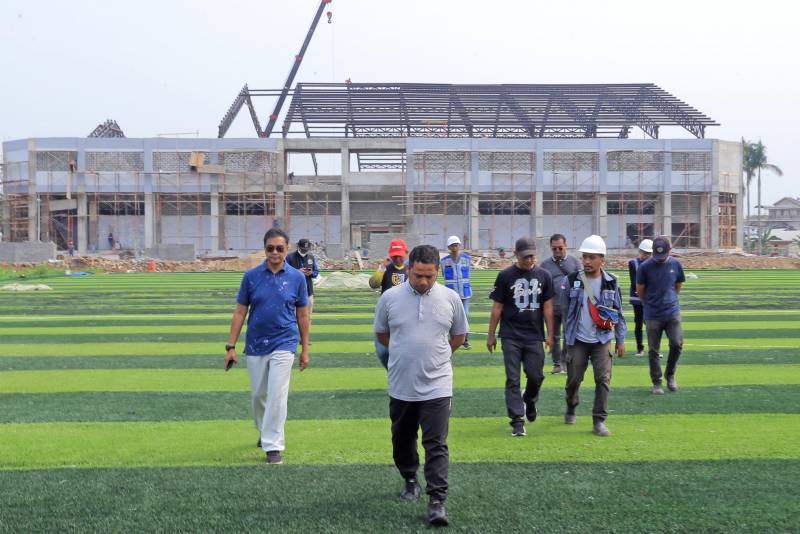 "Tolong dipastikan lagi jarak turapnya agar tidak mengganggu saluran irigasi dan airnya tidak masuk ke area sport center. Dan untuk lapangan bola juga harus dipastikan drainase cellnya terpasang semua di bawah rumput sintetisnya sehingga kalau hujan airnya cepat meresap dan tidak menggenangi lapangan," tukas Arief.