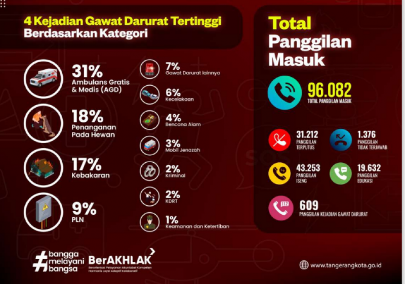 Kepala Unit Pelaksana Teknis (UPT) Pengelola Ruang Kendali Kota (Tangerang Live Room), Muhammad Iqbal Santoso menuturkan, Pemkot Tangerang selama ini telah menindaklanjuti pelayanan panggilan kejadian gawat darurat secara konsisten. Lanjutnya, persentase jumlah pelayanan tertinggi dari total 609 penggilan yang masuk, meliputi Ambulan Gratis dan Medis (AGD) sebesar 31 persen, penanganan pada hewan sebesar 18 persen, kebakaran sebesar 17 persen, penerangan sebesar 9 persen, dan sisanya masih banyak kategori-kategori yang lain.