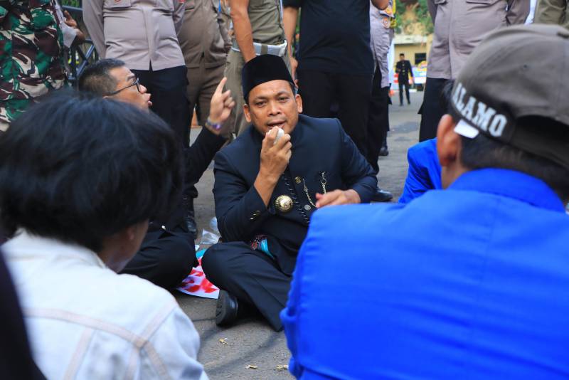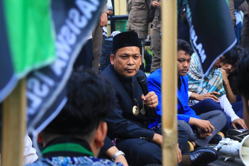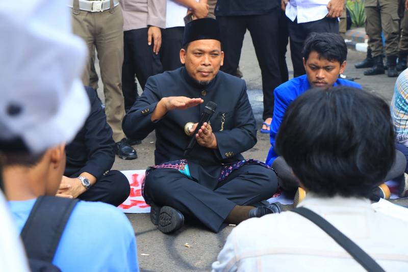 Penjabat (Pj) Wali Kota Tangerang, Dr. Nurdin, menerima dan menemui langsung sejumlah mahasiswa yang melakukan aksi damai di depan Gerbang Pusat Pemerintahan (Puspem) Kota Tangerang tepat di Hari Ulang Tahun (HUT) Kota Benteng yang ke-31, Rabu, (28/02/2024).