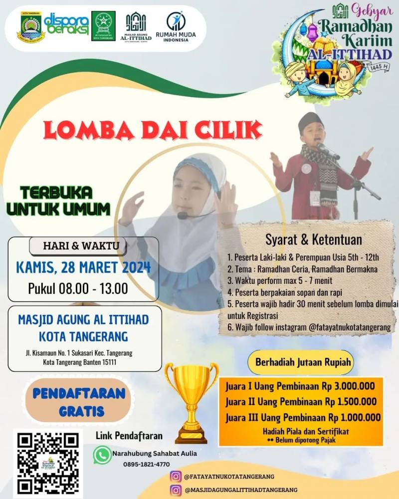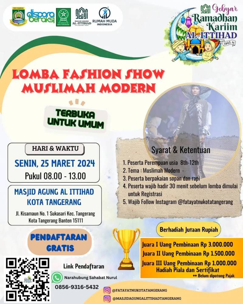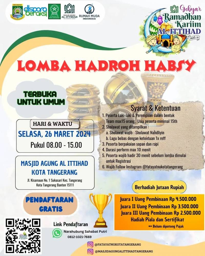 Untuk informasi mengenai serangkaian perlombaan secara lebih lengkap, mulai dari persyaratan pendafataran, mekanisme pendaftaran, sampai jadwal perlombaan dapat dilihat di media sosial Instagram resmi @masjidagungalittihadtangerang dan @fatayatnukotatangerang.