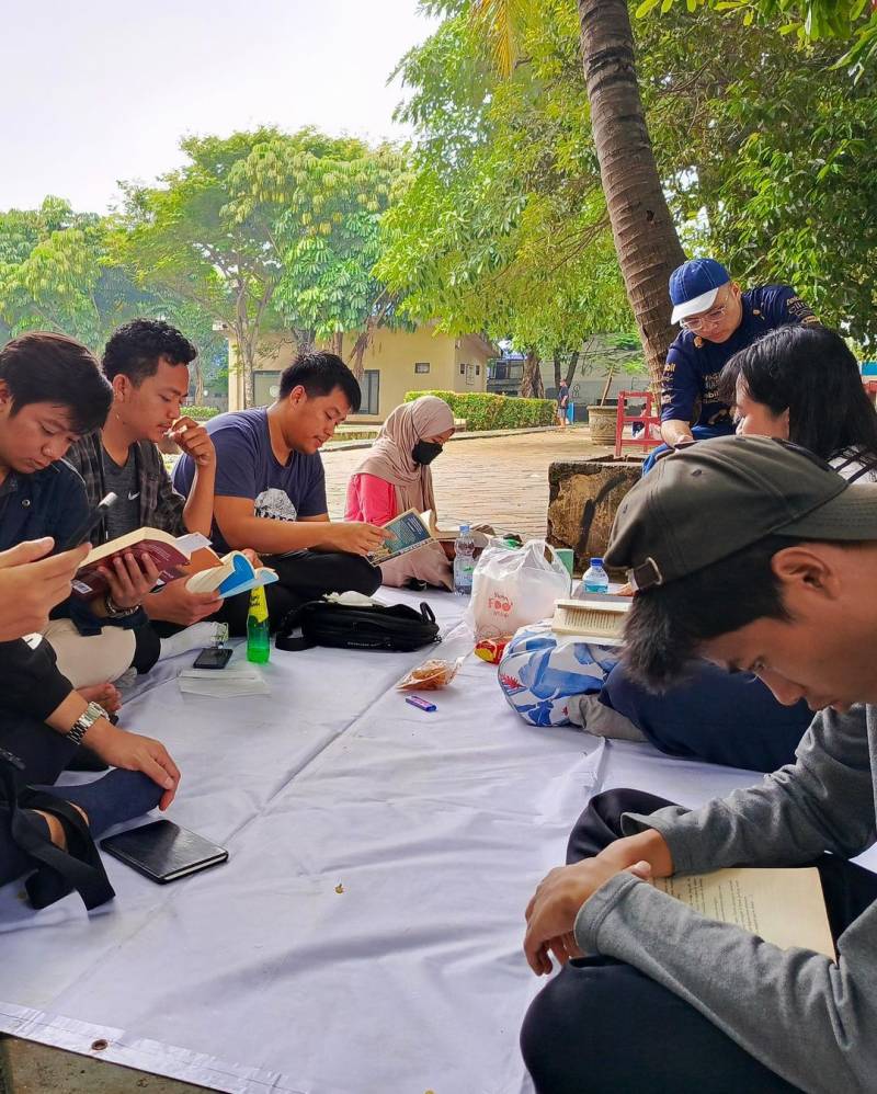 Di tengah gempuran kecanggihan dunia gadget, segerombolan anak muda Kota Tangerang memilih duduk melingkar di taman yang teduh, untuk melakukan aktvitas membaca buku bersama hingga berbagi pengetahuan.