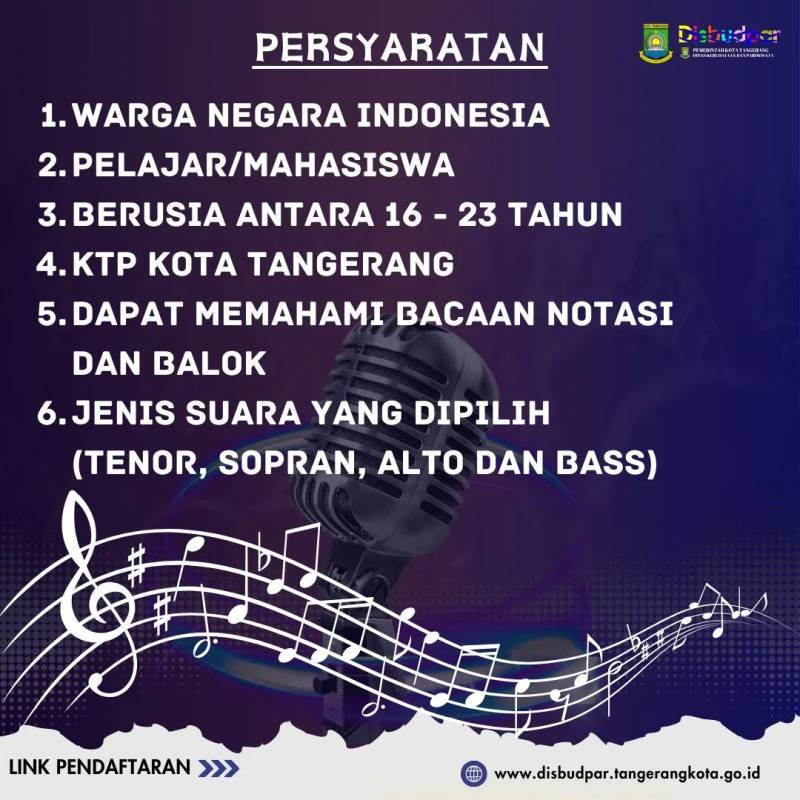 Ia melanjutkan, ada persyaratan yang harus dipenuhi peserta di antaranya adalah Warga Negara Indonesia, ber-KTP Kota Tangerang, pelajar/mahasiswa berusia 16 hingga 23 tahun, dapat memahami bacaan notasi balok. Audisi ini tidak dipungut biaya atau gratis.