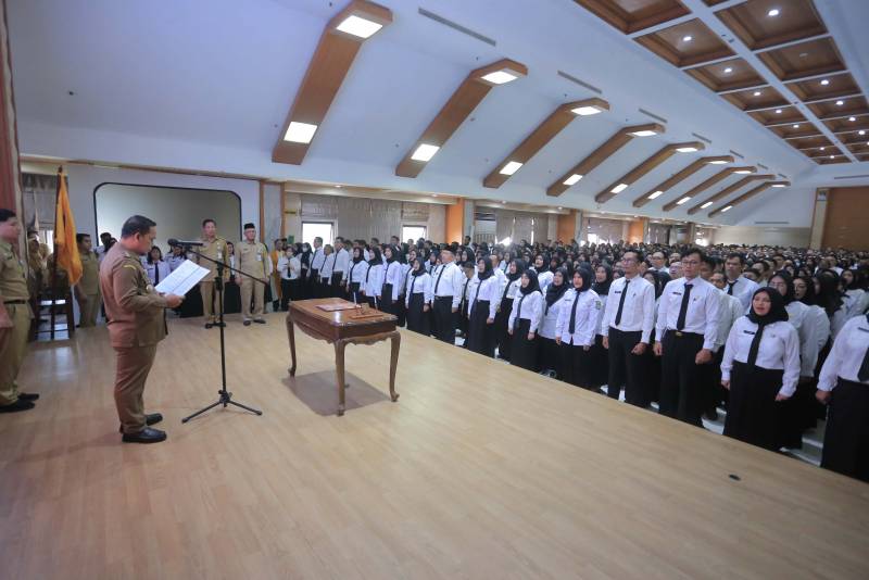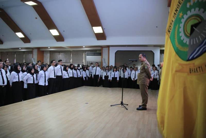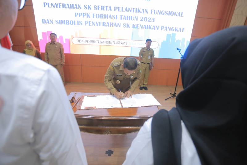 Penjabat (Pj) Wali Kota Tangerang, Dr. Nurdin, melakukan pengambilan sumpah jabatan fungsional dan penyerahan Surat Keputusan (SK) bagi PPPK formasi tahun 2023 sebanyak 1368 pegawai, sekaligus penyerahan SK kenaikan pangkat periode April 2024 secara simbolis kepada 306 pegawai, yang berlangsung di Aula Al-Amanah Pusat Pemerintahan Kota Tangerang, Senin (1/4).