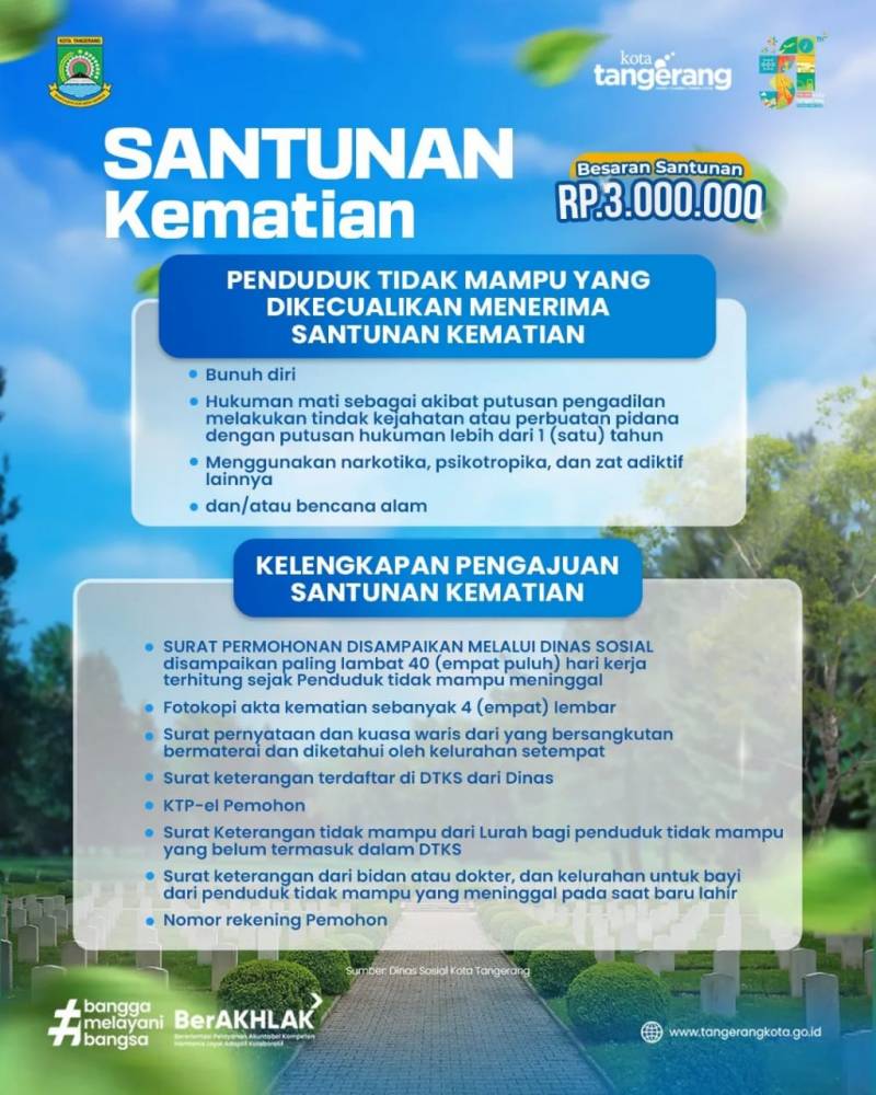 Pemerintah Kota (Pemkot) Tangerang melalui Dinas Sosial (Dinsos) terus menyosialisasikan adanya program santunan kematian. Santunan yang diberikan kepada masyarakat Kota Tangerang yang tergolong kurang mampu dan terdaftar dalam Data Terpadu Kesejahteraan Sosial (DTKS).