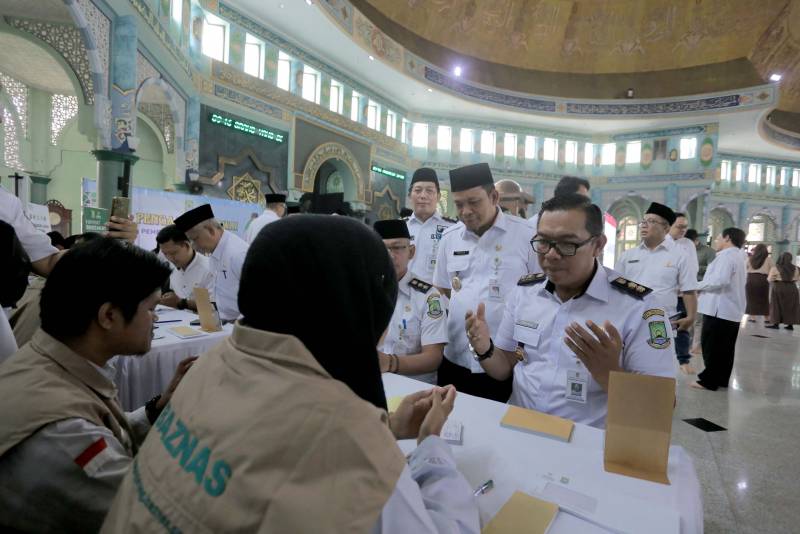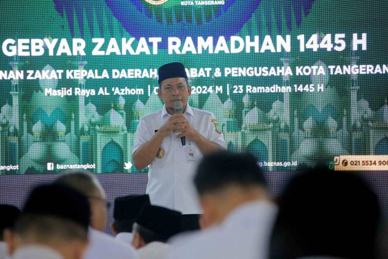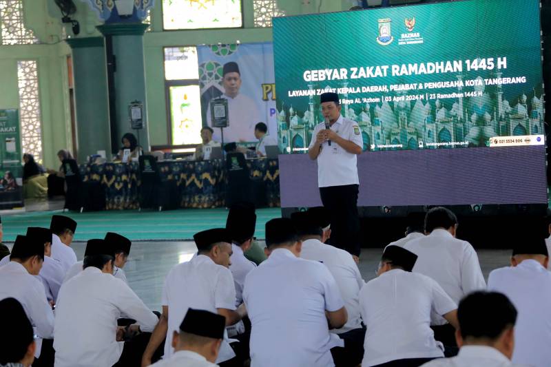 Pemerintah Kota (Pemkot) Tangerang berkolaborasi dengan Badan Amil Zakat Nasional (Baznas) Kota Tangerang menggelar kegiatan Gebyar Zakat Ramadan 1445 Hijriyah, yang berlangsung di Masjid Raya Al-A’zhom, Rabu (3/4).