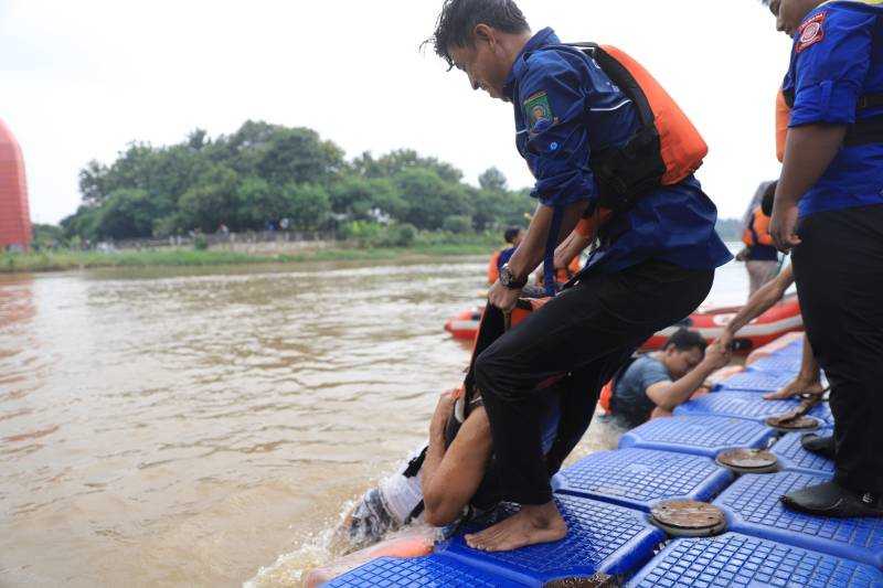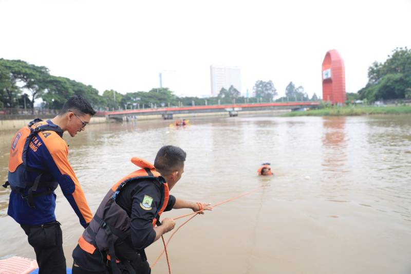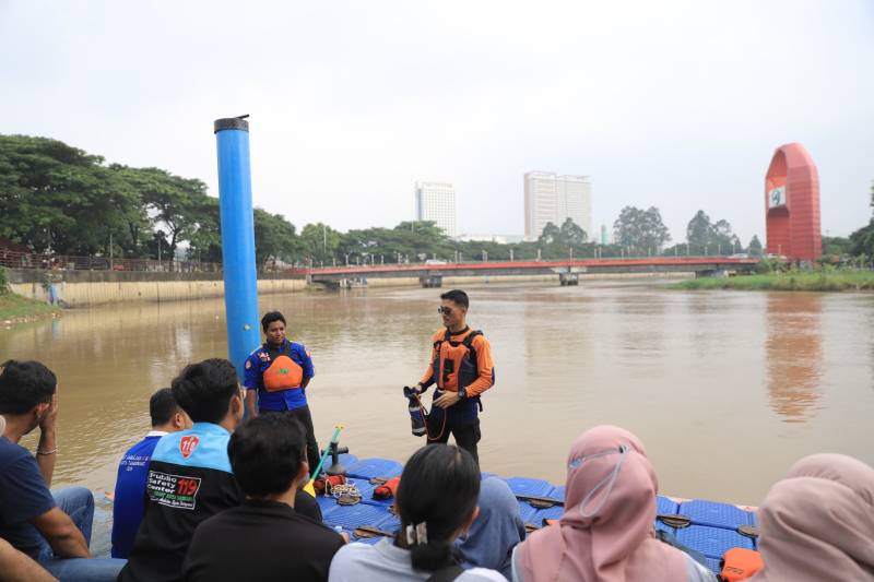 Dinas Kesehatan (Dinkes) Kota Tangerang bekerja sama dengan Dinas Sosial (Dinsos) Kota Tangerang dalam hal ini Tagana menggelar pelatihan water rescue di Sungai Cisadane, Kelurahan Babakan, Kecamatan Tangerang, Rabu (24/4/24).
