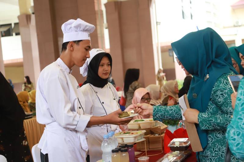 Hal senada juga diungkapkan, Pasya dan Aurel dari SMKN 7 Kota Tangerang. “Pada perlombaan ini, kami membawa nasi, pepes ayam kemangi, urap, puding dan nagget tahu. Tahun lalu, kami berhasil juara 2, semoga tahun ini bisa kembali menaklukkan juara lagi,” seru Pasya.