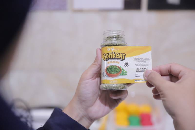 "Prosesnya juga sangat mudah karena hanya mengeringkan daun kelor, saya gunakan dehydrator. Lalu, digiling dengan chopper, dan ditambahkan kaldu ikan teri. Jadi, Bonkeri dapat digunakan sebagai taburan atau topping ketika anak-anak makan," ungkapnya.