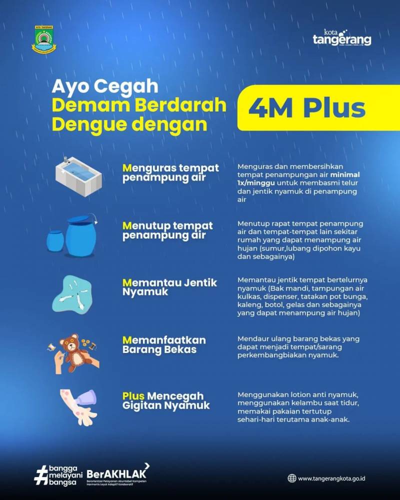 Intensitas hujan yang mulai meningkat di Kota Tangerang, dapat menyebabkan sarang nyamuk di lingkungan. Dengan itu, masyarakat #KotaTangerang khususnya pemukiman padat penduduk diimbau untuk menggencarkan aksi gotong royong bersama dengan Pemberantasan Sarang Nyamuk (PSN) dengan 4M Plus di lingkungan.
