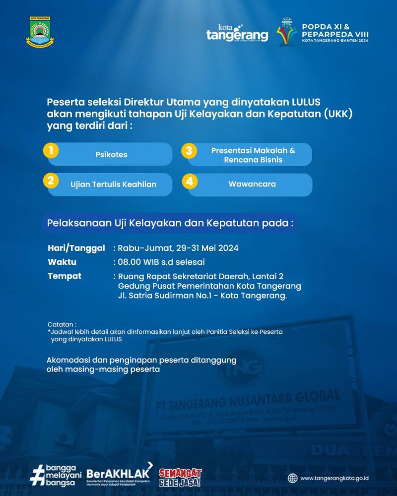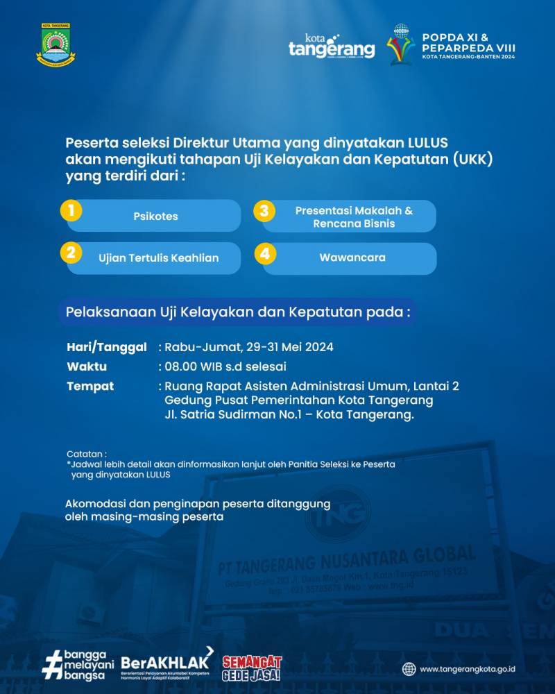 Sebagai informasi, PT TNG telah membuka seleksi terbuka Calon Direktur PT TNG Kota Tangerang periode 2024-2029 mulai 13 Mei lalu.