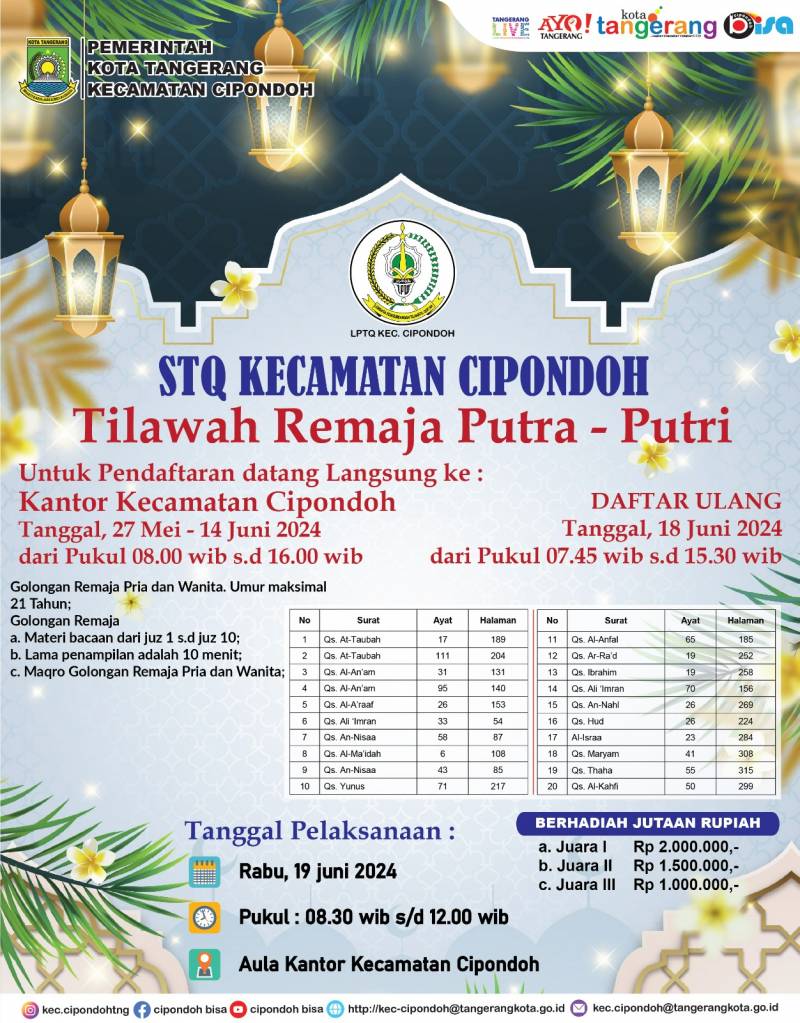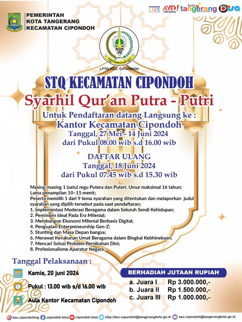 Pemerintah Kecamatan Cipondoh bersama Lembaga Pengembangan Tilawatil Qur’an (LPTQ) Cipondoh kembali menyelenggarakan Seleksi Tilawatil Qur’an (STQ) Tahun 2024. Dilengkapi dengan total hadiah bernilai jutaan rupiah, ajang bergengsi tersebut akan diselenggarakan mulai 19-20 Juni 2024 mendatang.