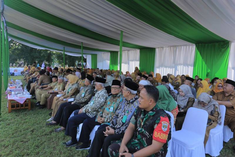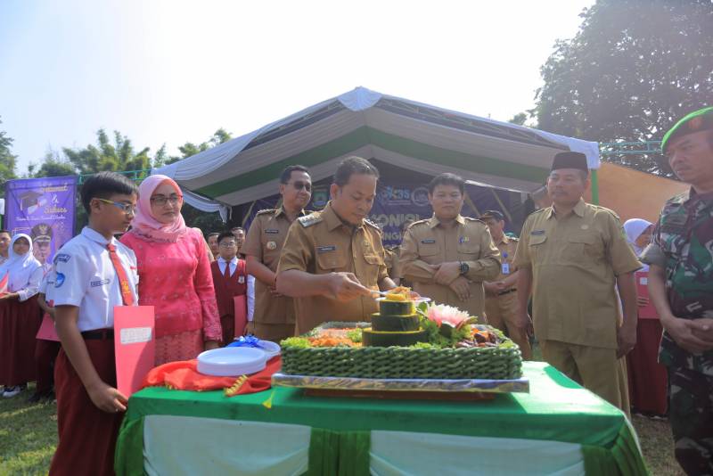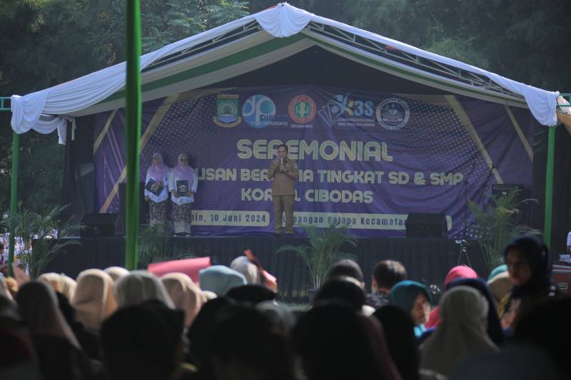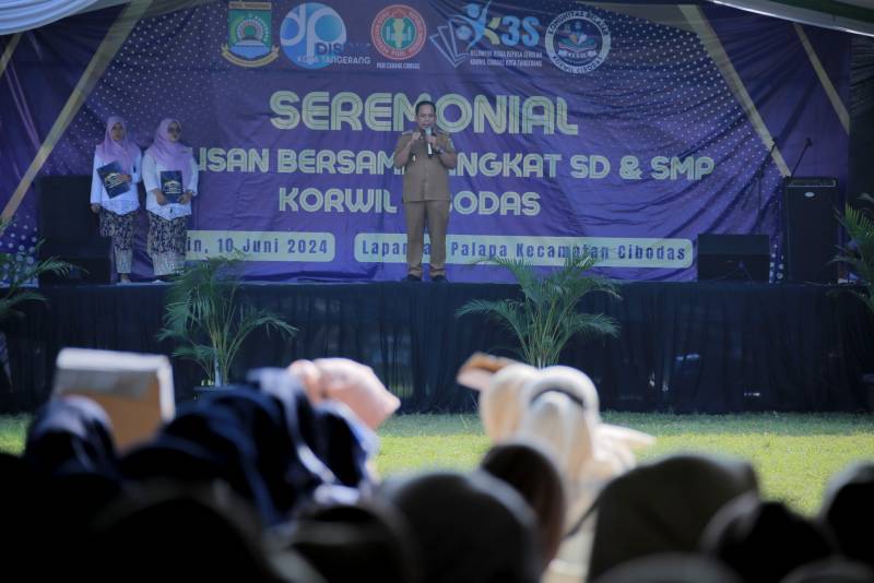 Penjabat (Pj) Wali Kota Tangerang, Dr. Nurdin, menghadiri acara pembagian surat kelulusan secara bersamaan di tingkat SD dan SMP Kecamatan Cibodas di Lapangan Palapa, Kota Tangerang, pada Senin (10/6).